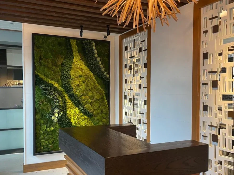 First off, the traditional greenery. Like I said before, this isn’t limited to just potted plants. The picture I chose to represent this shows a gorgeous moss wall, strategically placed at the reception area of a space.
